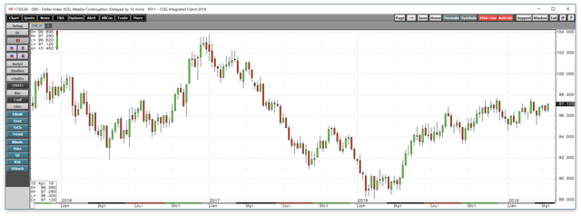 As the weekly chart of the dollar index shows, the dollar has made nothing but higher lows since reaching a bottom at 88.15 in February 2018. However, it has not risen to a new high and has failed on each attempt in 2019, so far.