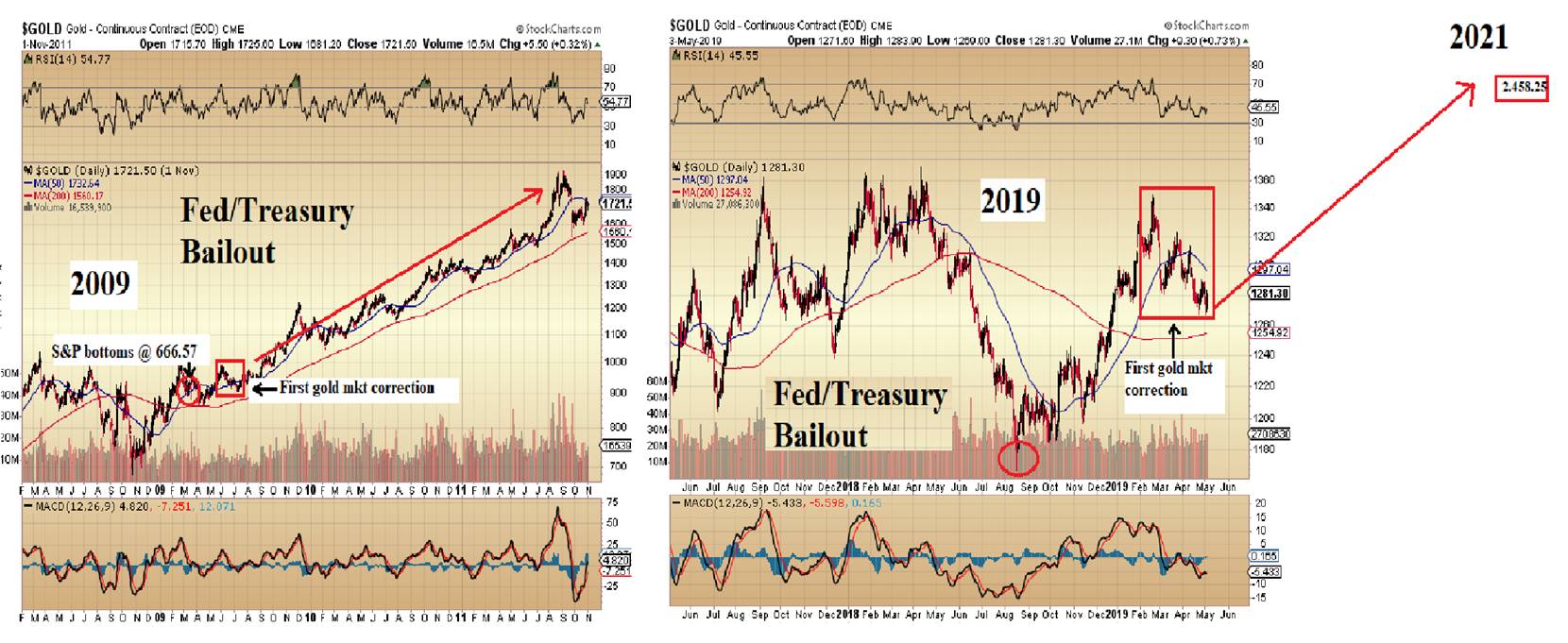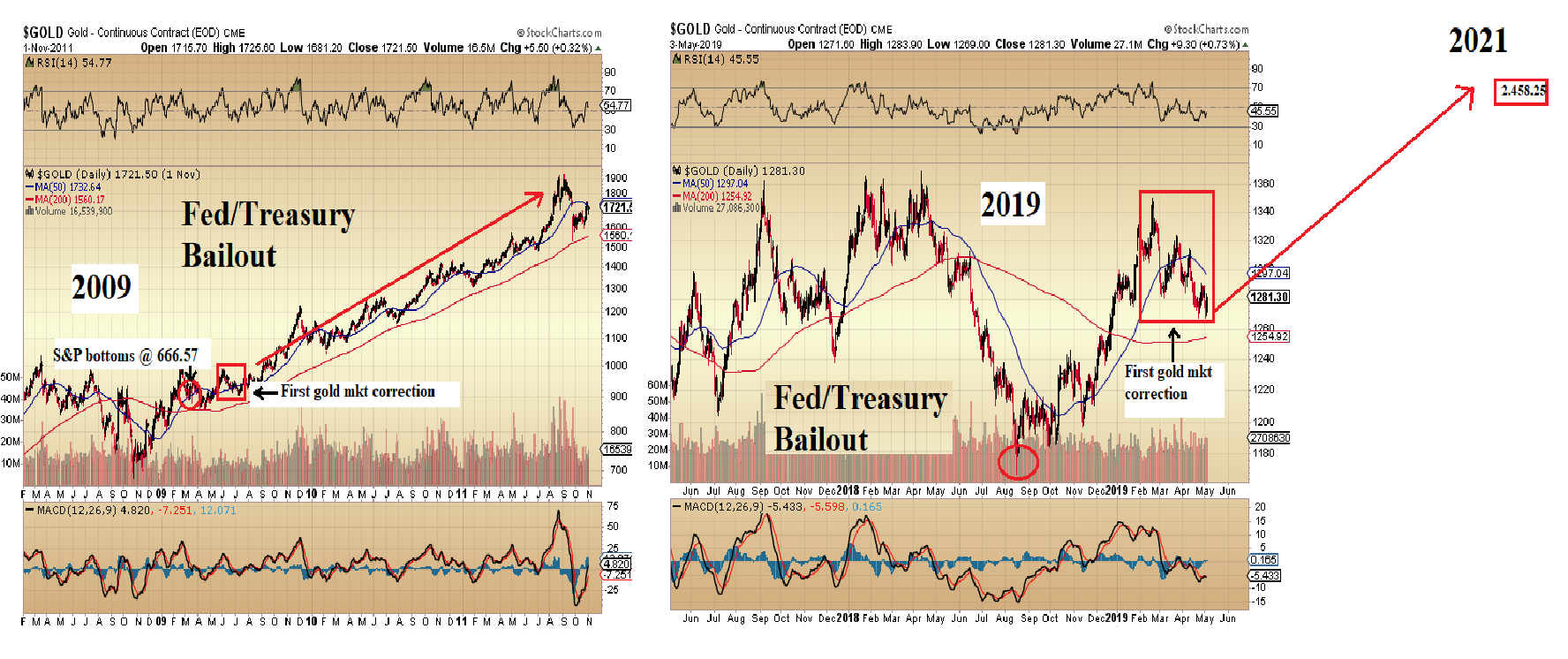 Look at these charts. Can any of you honestly see any difference? They both reek of intervention but the only difference is that the one from 2009 has now had books and movies written about it. We know that no one went to jail over the causes of the crash, and we know that the method used by the central bankers to correct the problem (which was to take in all of the toxic paper that was rotting their balance sheets) resulted in more debt creation ($14 trillion worth). This was exactly the root of the 2018 problem because as soon as they tried to remove the 2009 "bandaid,"they were catapulted right back to 2009. Stocks were simply gravitating back to their old trajectory before the Fed/Treasury bailout temporarily saved the stock market. What we got last Christmas Eve was the same bailout as in 2009, but it came about before people started to lose jobs and homes. The "V-bottom"turns in 2009 and in 2019 are identical, and emanated from interventions of the highest order and priority.