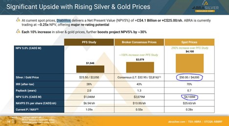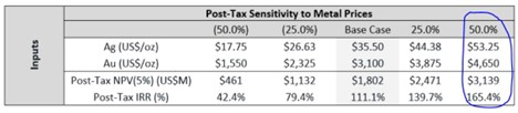 Just their Pre-Feasibility Study (which was based on a smaller resource than the upcoming DFS will be based on) has a Net Present Value of US$4.1 billion at price sensitivities of just US$50 silver and US$4,000 gold, along with an IRR of 70%. That number will likely be going up substantially with their DFS, especially if one factors in US$60 silver and US$4,250 gold price assumptions.