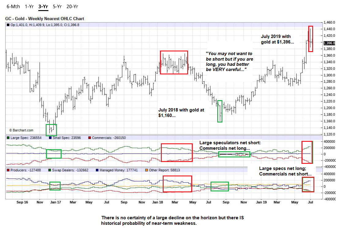 The next chart carries the graphic images of how bottoms occur when the Large Spec positions converge with those of the Commercials, and vice-versa at tops. Those alligator jaws, so wide open as of Monday's COT report, are destined to snap shut, but only after serious price declines. Now, there is the possibility of the signal failure in which the Commercials are forced to cover into rising prices, but my interpretation is that since we saw little if any capitulation from the shorts into the gap to $1,442, I see little evidence of a squeeze near term with prices now back below $1,400.