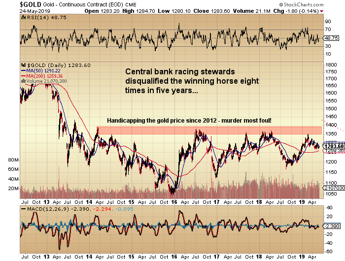 It is important to recall that in 2010, the investing public was still reeling from the all-out devastation wrought upon them by the bankers, and did not have nearly the liquidity then that they have today. Yet, in the final analysis, forecasting gold's direction, amplitude and timing is an exercise in handicapping the odds in the same manner that you try to predict the outcome of a horse race and as everyone learned too painfully from this year's Kentucky Derby, you can pick the horse and still lose all of your money if someone intercedes and disqualifies the winner. That is exactly what has happened to investors in gold that correctly predicted the monetary and fiscal turmoil that unfolded in 2009: They picked the right horse but the central bank racing stewards disqualified it in 2011. Total, complete, unadulterated disqualification the likes of which we are encountering here in 2019.