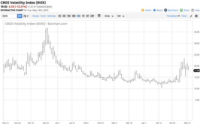 The chart of the VIX volatility index shows that the metric that moves higher when stock prices move to the downside traded up to $23.38 on Monday, May 10 and was around the 20 level at the end of the session as all of the leading share indices in the US posted significant losses of between 2-3% on the session. Since China has suffered more under the wave of protectionism over the past year, Chinese large-cap stocks fell after the latest exchange of protectionist measures as talks hit a roadblock.