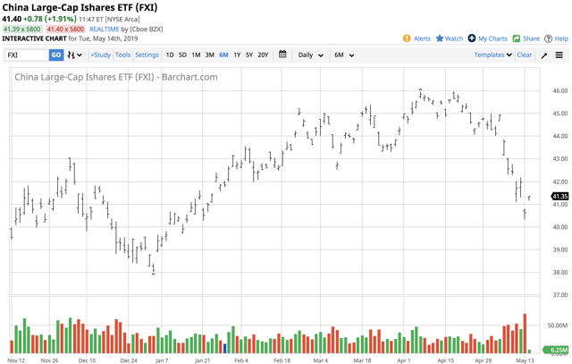As the chart shows, the ETF that reflects the price action in Chinese large-cap stocks fell from a high at $45.96 on April 5 to a low at $40.32 on May 13, a decline of 12.3%.