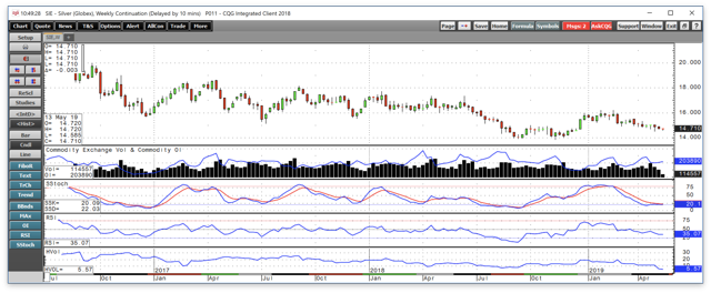 Meanwhile, both gold and silver rose to highs in July 2016 at $1377.50 and $21.095 per ounce respectively. At their settlement prices on May 13, gold was just $75.70 or 5.8% below the line in the sand on the upside, while silver was $6.318 or 42.8% below its resistance level. Silver has been bearish, and the trend in the precious metals remains bearish as it has made lower highs and lower lows since July 2016.