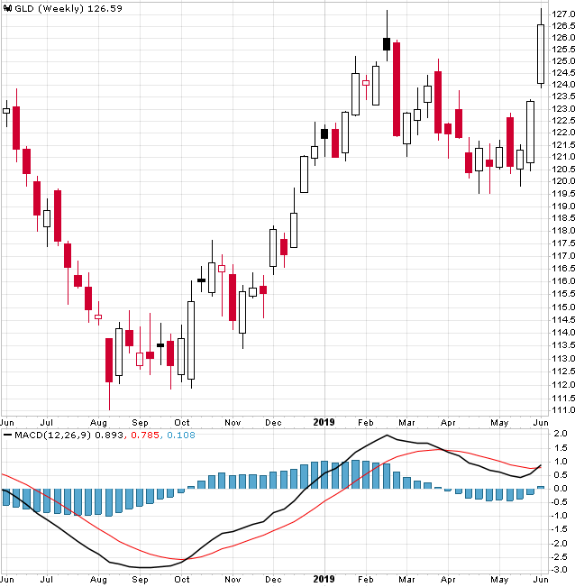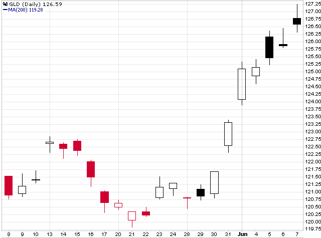 Since late May, GLD has staged a significant rally (up each of the last 8 trading sessions) and suddenly is sitting near highs from earlier in the year.