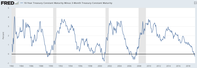 The greatest signal of a looming recession is being given by the bond market, as the yield curve is now inverted. History has shown that when the yield on the 10-year is less than yield on the 3-month treasury bill, then a recession will occur in the not-too-distant future.