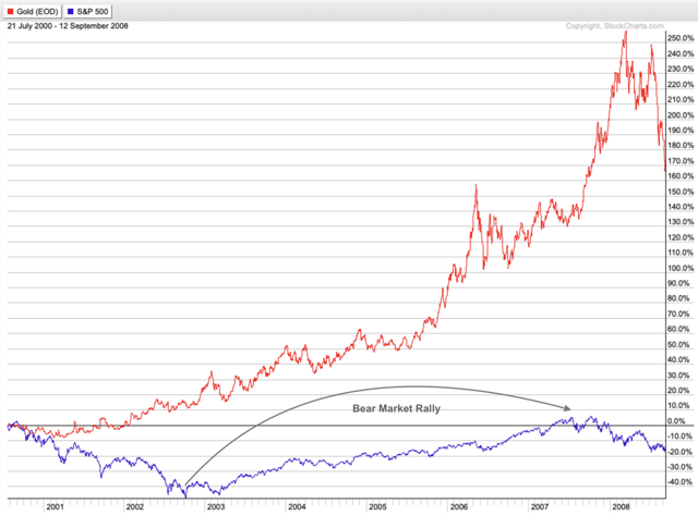 Gold is the direct beneficiary of all of this uncertainty in the stock market, as there is strong inverse correlation between the two. Their respective bull cycles don't occur at the same time. If the S&P is doing well, it's likely that gold is stagnant or struggling to hold form.