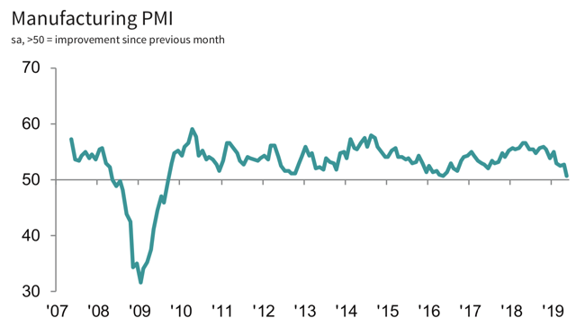 The U.S. Manufacturing PMI declined to 50.5 in May, which is the lowest level since September 2009. Meanwhile, new orders contracted for the first time in almost a decade as customers delayed purchase orders due to uncertainty with the economic outlook. This weakness in manufacturing will act as a drag on GDP. The fact that it's also showing the weakest growth since the Great Financial Crisis doesn't exactly bode well for the argument that the 10-year long expansion will continue.