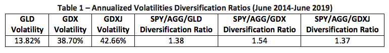 So, what's the best way to get gold's diversification benefit? Is it to hold a bullion surrogate like GLD or is a gold miner ETF better? Past performance can help us quantify each of the funds' probable effects. Synergy created by adding an asset to a portfolio is reflected in the diversification ratio, produced by putting the summed weighted component risks in the numerator and the actual portfolio risk in the denominator. A ratio greater than one (1.00) denotes a diversification benefit.