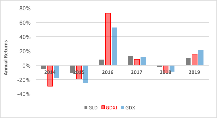 This differential performance of bullion and mining stocks is longstanding. Gold miners are just more volatile. About three times as volatile, in fact. You can see volatility reflected in the annual returns notched by mining stocks: Miners have outdone bullion on both the upside and the downside for a long, long time. Chart 1 below, portraying five years of recent returns, gives you a snapshot view.
