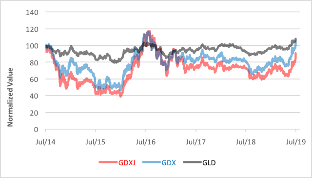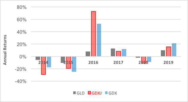 As of last week's close, GLD's five-year cumulative return of 6.4% has edged out the 4.1% gain earned by GDX.