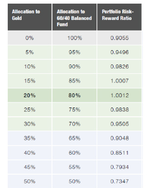 A study conducted by Flexible Plan Investments used these average returns and the average time spent in each quadrant to determine the optimal allocation of gold to a portfolio. It determined that a 20% allocation to gold, with 48% in equities, and 32% in treasuries provided the highest Sharpe ratio as evidenced in the chart below.