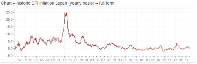 As the adage goes, past performance does not necessarily predict future results. Saddled with rising debt and a wave of retiring baby boomers, there's a chance that the U.S. remains stuck in a Japan-like deflationary spiral. The chart below shows that Japan's inflation rate poked its head above 2% only twice since 1985, oftentimes falling into negative territory. This "Japanification" of the western world thesis is one to take seriously. The 1970s inflation was largely demographic-based, as baby boomers entered the workforce en masse, purchasing new homes and cars in the process. With demographic trends skewing the numbers in the study above, I would reduce the optimal allocation of gold from 20% to 10%.